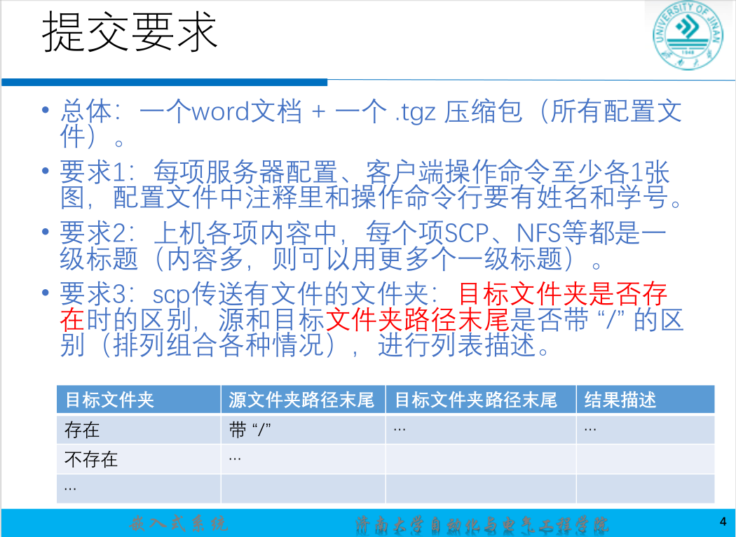 基本要求只需要配置SCP和NFS,配置SCP和NFS的文件时候添加上自己的学号截图,使用SCP和NFS的时候截图并放在Word里,把word和压缩后的配置文件上交即可